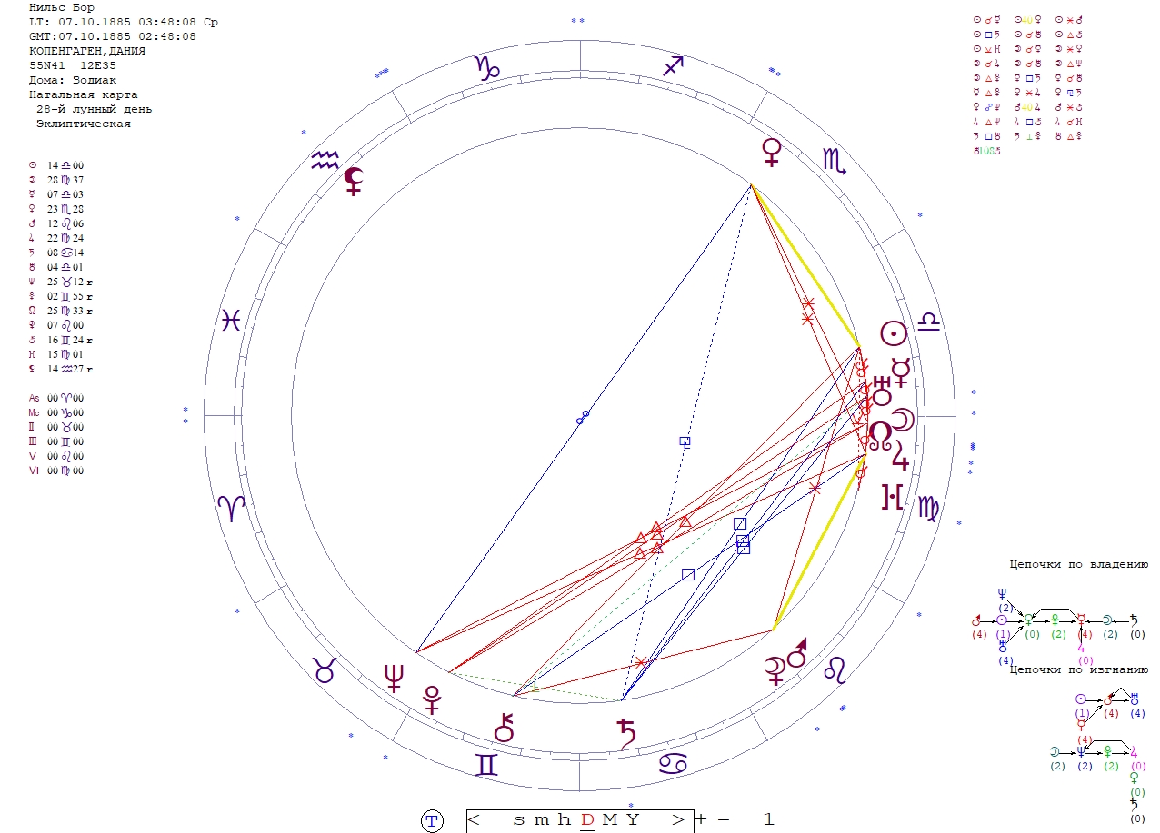 Нильс Бор: Солнце, Меркурий, Уран в конъюнкции, Уран в тридециле к Хирону, Солнце в тригоне к Хирону.