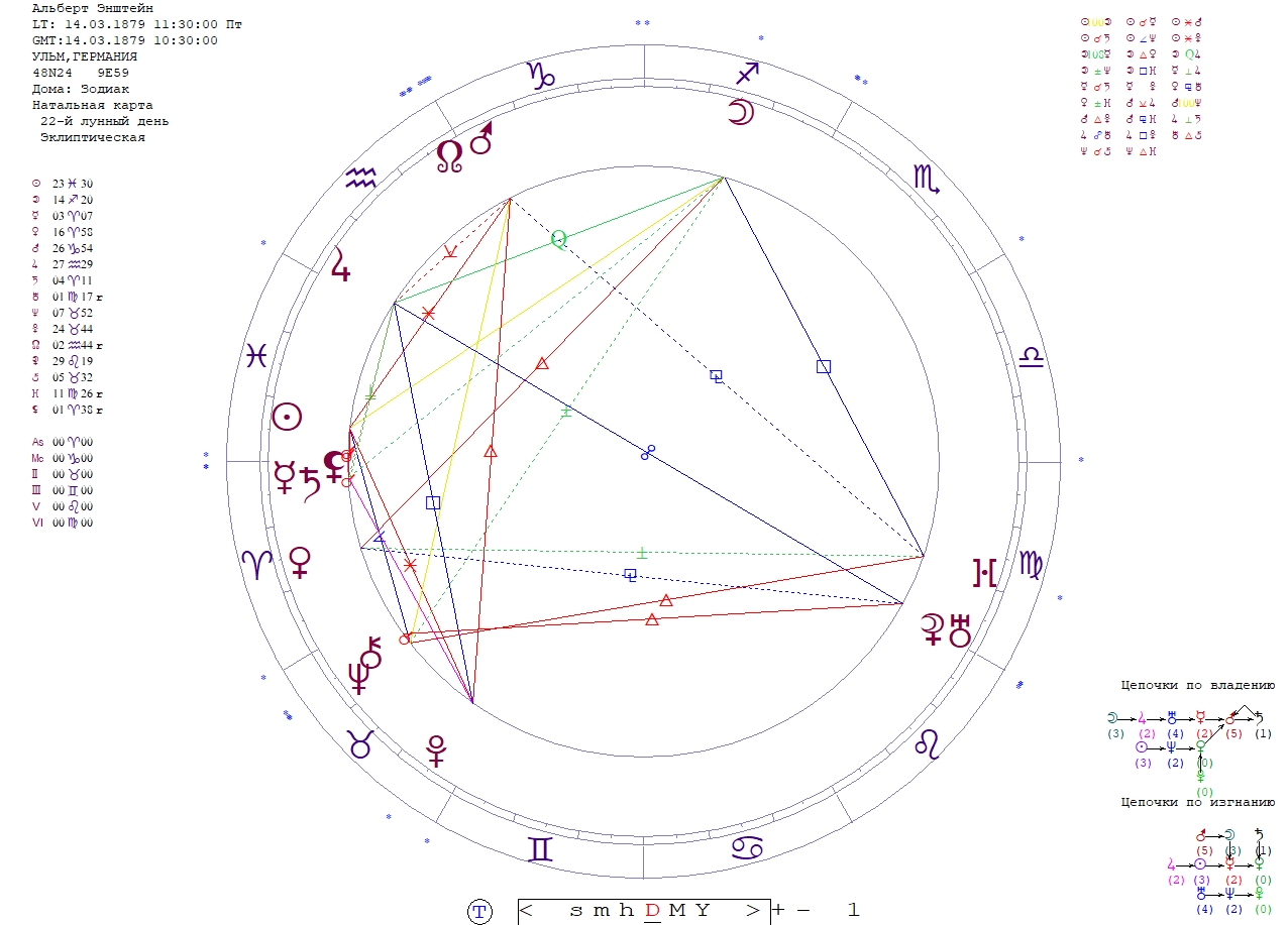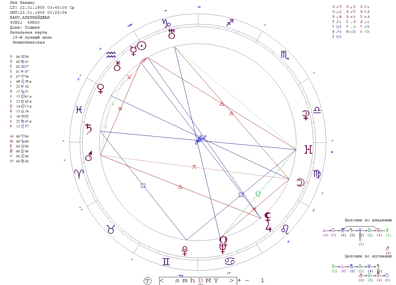 Ландау Лев Давидович: Солнце, Меркурий, Хирон в Водолее, Солнце в тригоне с Прозерпиной, Уран в тридециле с Прозерпиной.