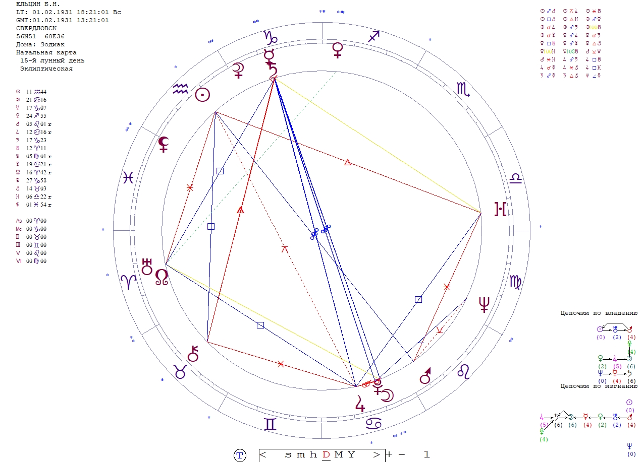 Борис Ельцин: Смешанные аспекты: Солнце в Водолее, в трине с Прозерпиной, в секстиле с Ураном, но квадрате с Хироном. Меркурий в квадратуре с Ураном, но в трине с Хироном.