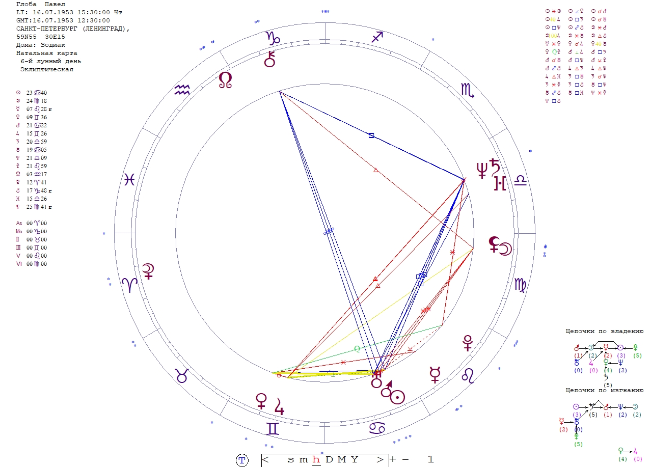Павел Глоба. Солнце в соединении с Ураном, но обе планеты в оппозиции с Хироном. Оно и видно, наш уважаемый известный астролог позволяет себе основываться только на статистике и древней символике, запросто поступась философией астрологии.