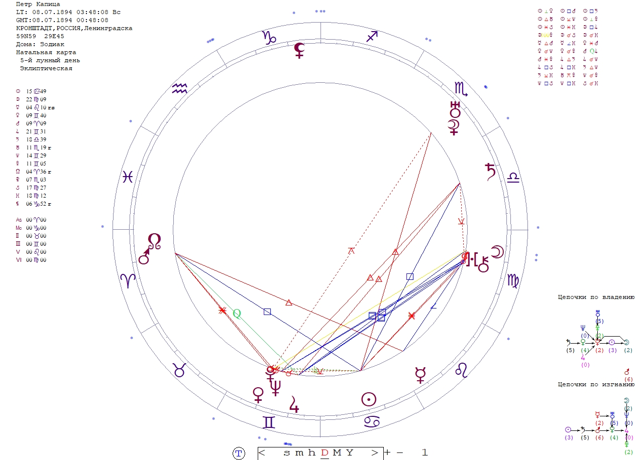 Капица Петр Леонидович: Солнце в тригоне с Ураном и секстиле с Хироном и Прозерпиной в Деве, Меркурий в полуквадрате с Прозерпиной. Когда есть разные конфигурации аспектов, т.е гармоничные и негармоничные, ученые переживают, что их изобретения могут быть использованы политиками в неблагородных целях.