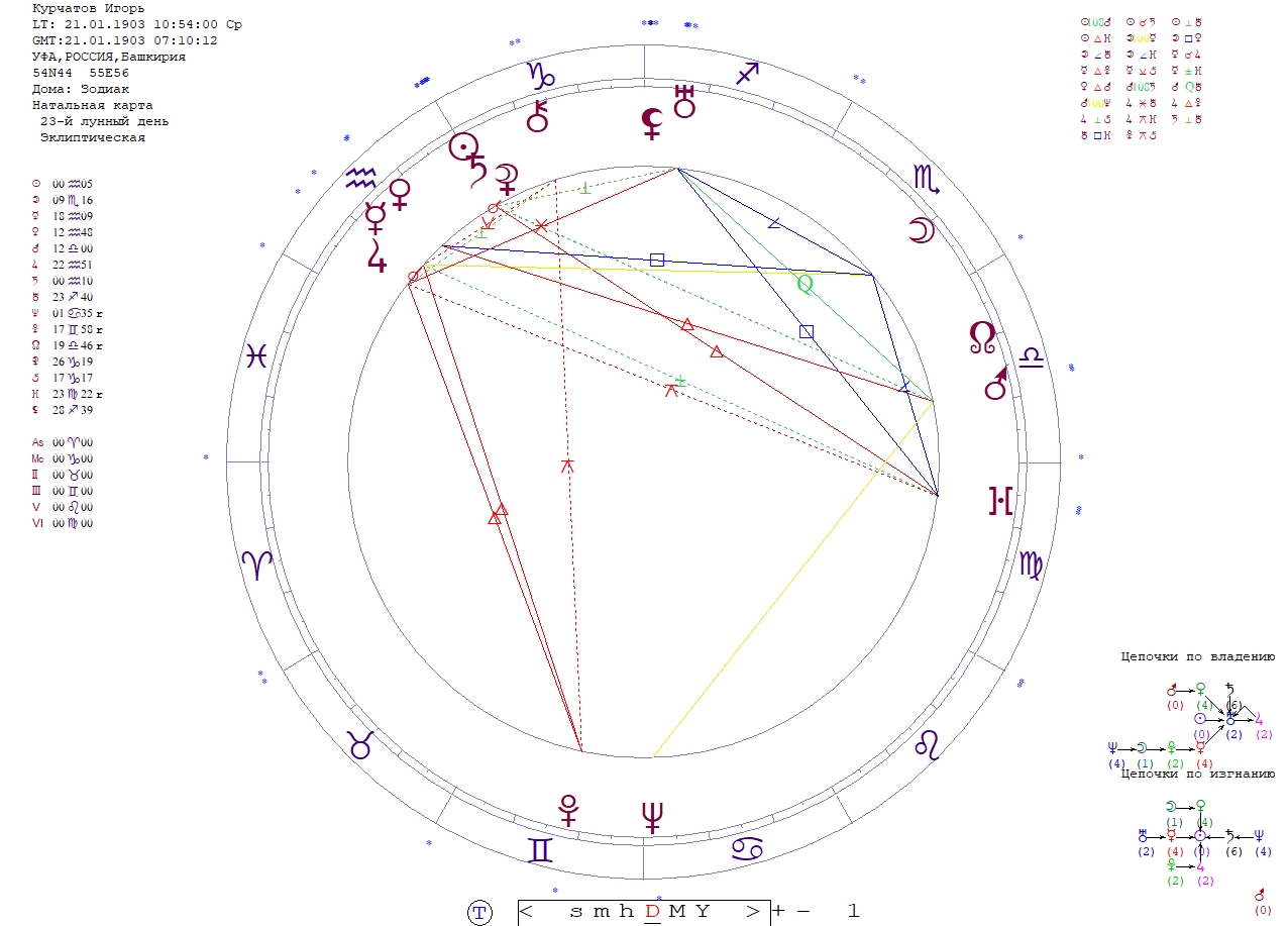 Курчатов Игорь Васильевич: Солнце и Меркурий в Водолее, Солнце в тригоне с Прозерпиной и биквинтиле с Ураном.