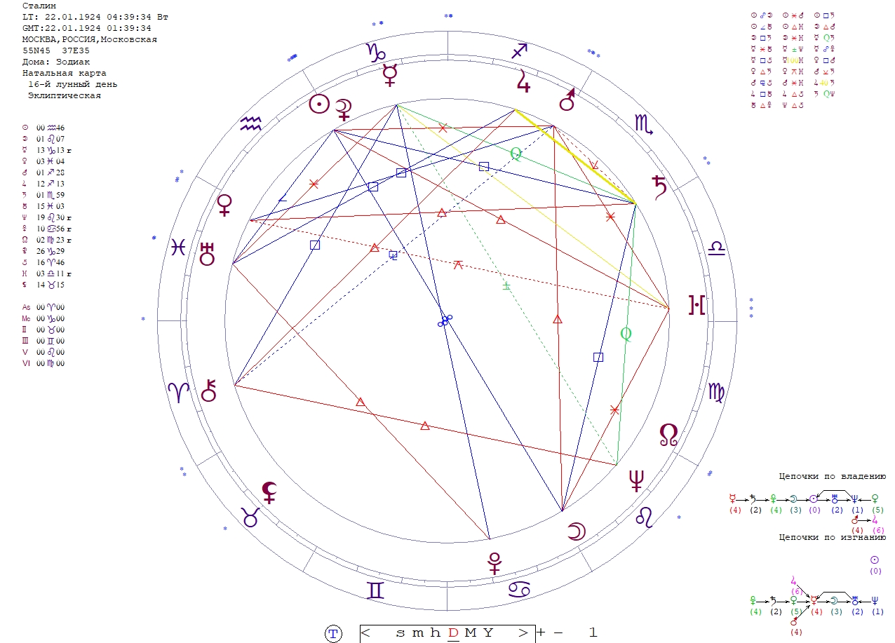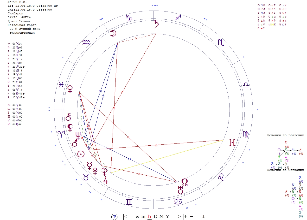 Владимир Ульянов (Ленин): Солнце в тригоне с Прозерпиной, в соединении с Меркурием в одном знаке, но он "сожженный", и его влияние ослабляется. Меркурий в дециле с Хироном.