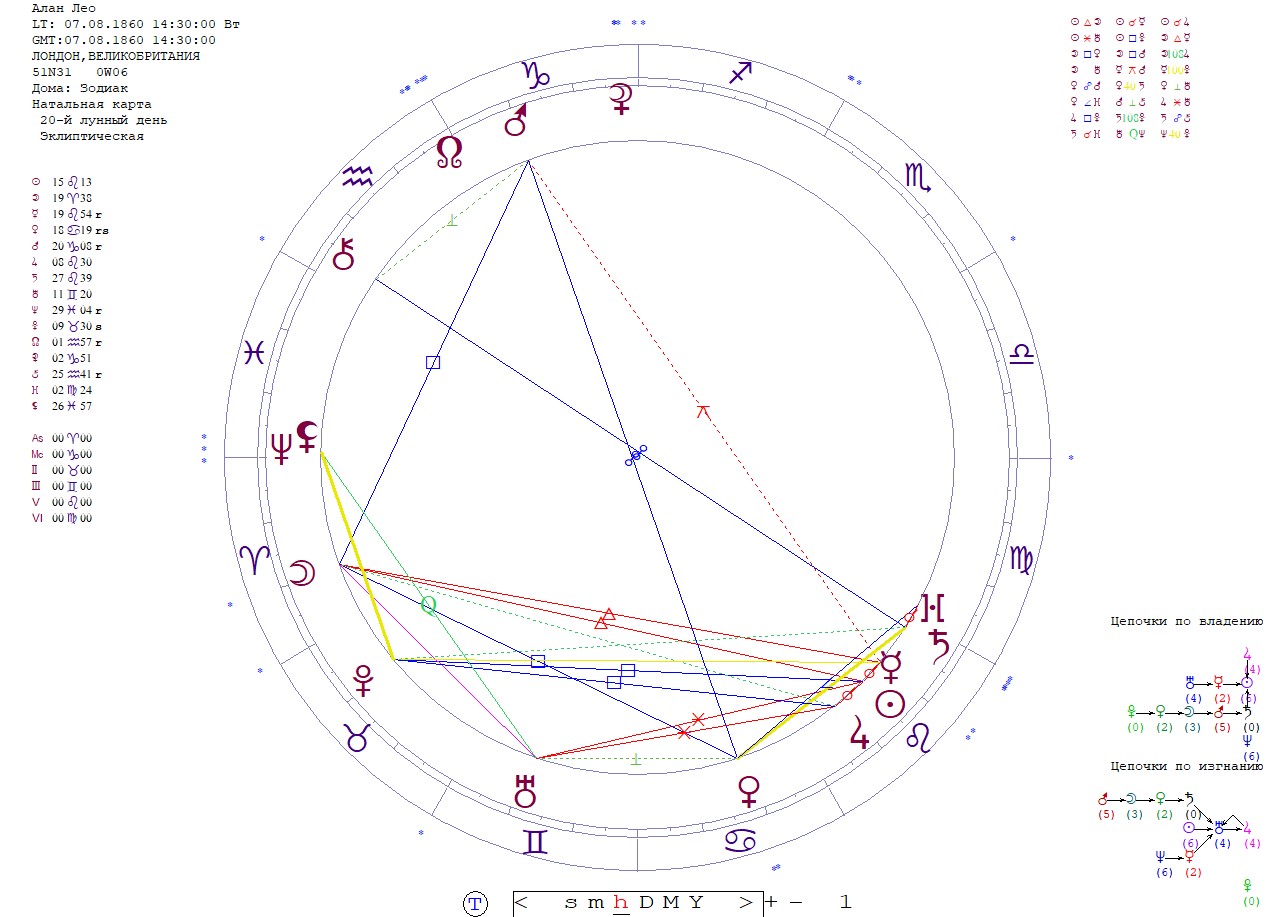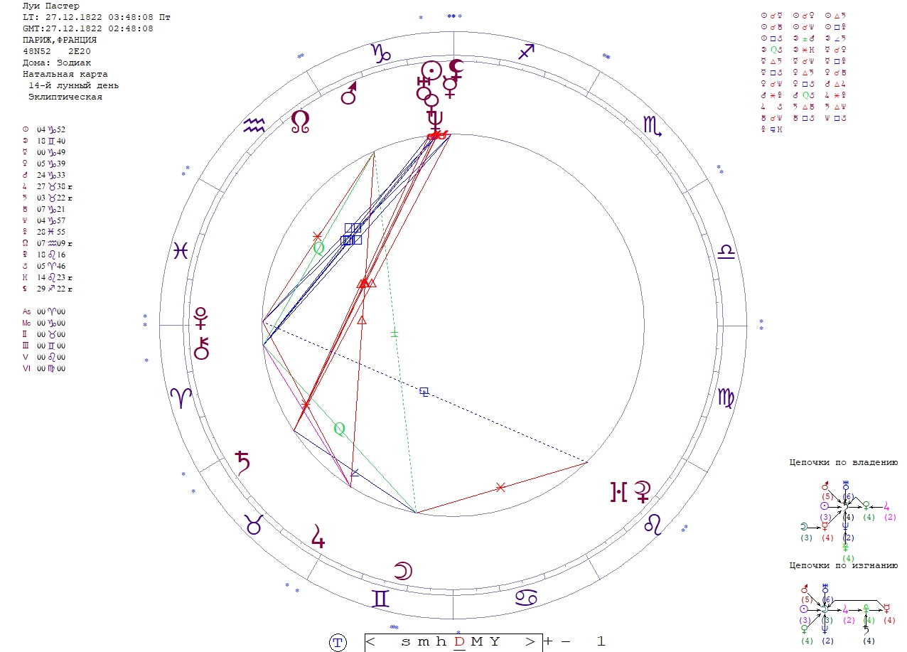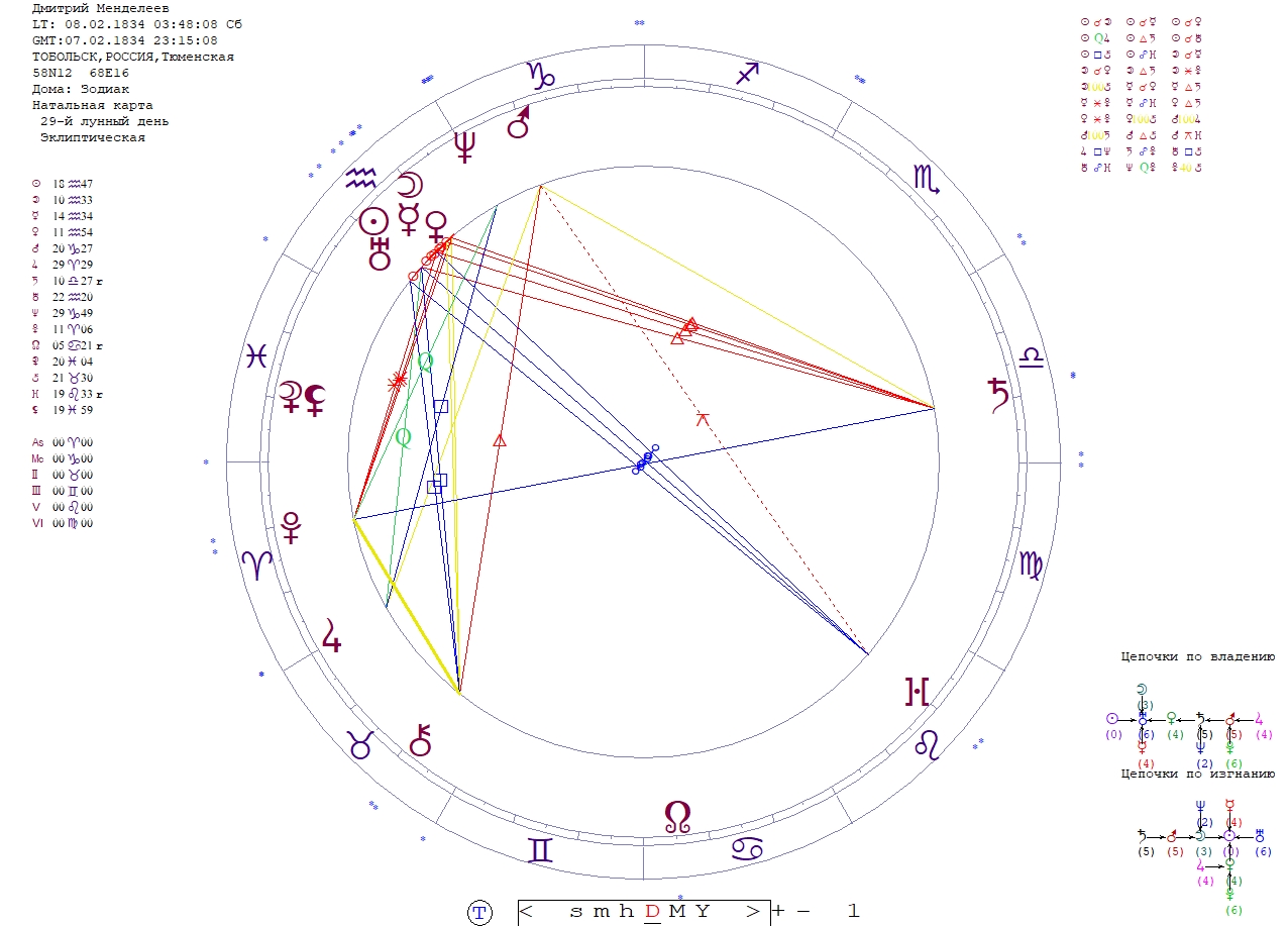 Менделеев Дмитрий Иванович: Солнце, Меркурий, Уран в Водолее, но все три планеты в оппозиции с Прозерпиной во Льве, а Уран и Солнце квадратуре с Хироном. Увы, Дмитрий Иванович активировал свою мозговую деятельность с помощью курения табака, но блокировал при этом свой разум. Оппозиция к Прозерпине во Льве дала сильные переживания, что у себя на Родине его так и не признали академиком.