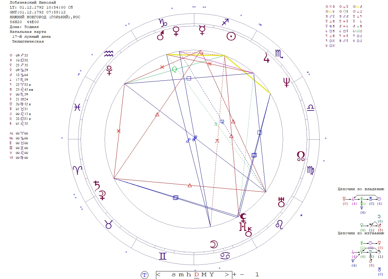 Лобачевский Николай Иванович: Меркурий в тригоне с Ураном, Солнце в тригоне с Хироном.