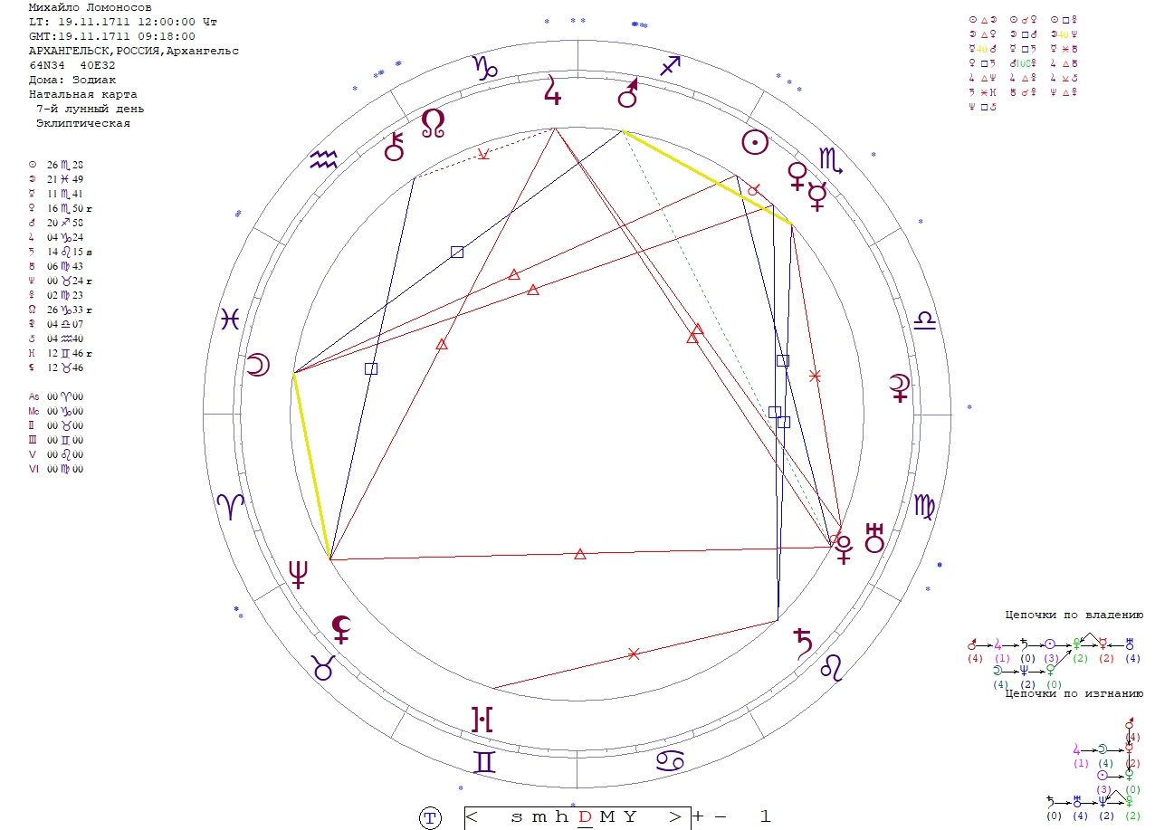 Ломоносов Михаил Васильевич: Хирон в Водолее, между Меркурием и Ураном - секстиль.