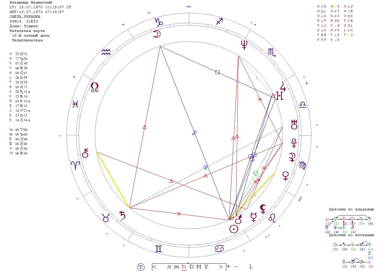 Владимир Мединский: Солнце в квадратуре с Прозерпиной, это дает несколько узкую направленность - история, но Солнце в квинтиле с Ураном, Меркурий в тригоне с Хироном и секстиле с Ураном. Очень неплохо, но уровень сознания оставляет желать лучшего. Будучи министром культуры позволил "чудовищное осквернение фокуса Света, закреплённого Нами в музее Рериха в столице России". Конечно вина не только его, но теперь Москва осталась без защиты.