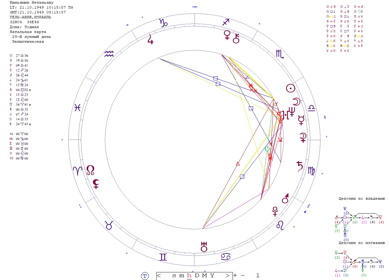 Биньямин Нетаньяху. Здесь тоже не очень. Солнце в нонагоне с Хироном, но в трине с Ураном. Меркурий в квадрате с Ураном. Также все решается с позиции силы - Марс и Плутон во Льве.