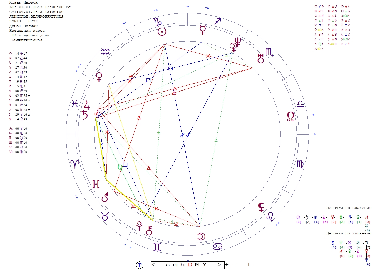 Исаак Ньютон: Уран в секстиле с Солнцем, в дециле с Меркурием, Солнце в биквинтиле с Хироном.