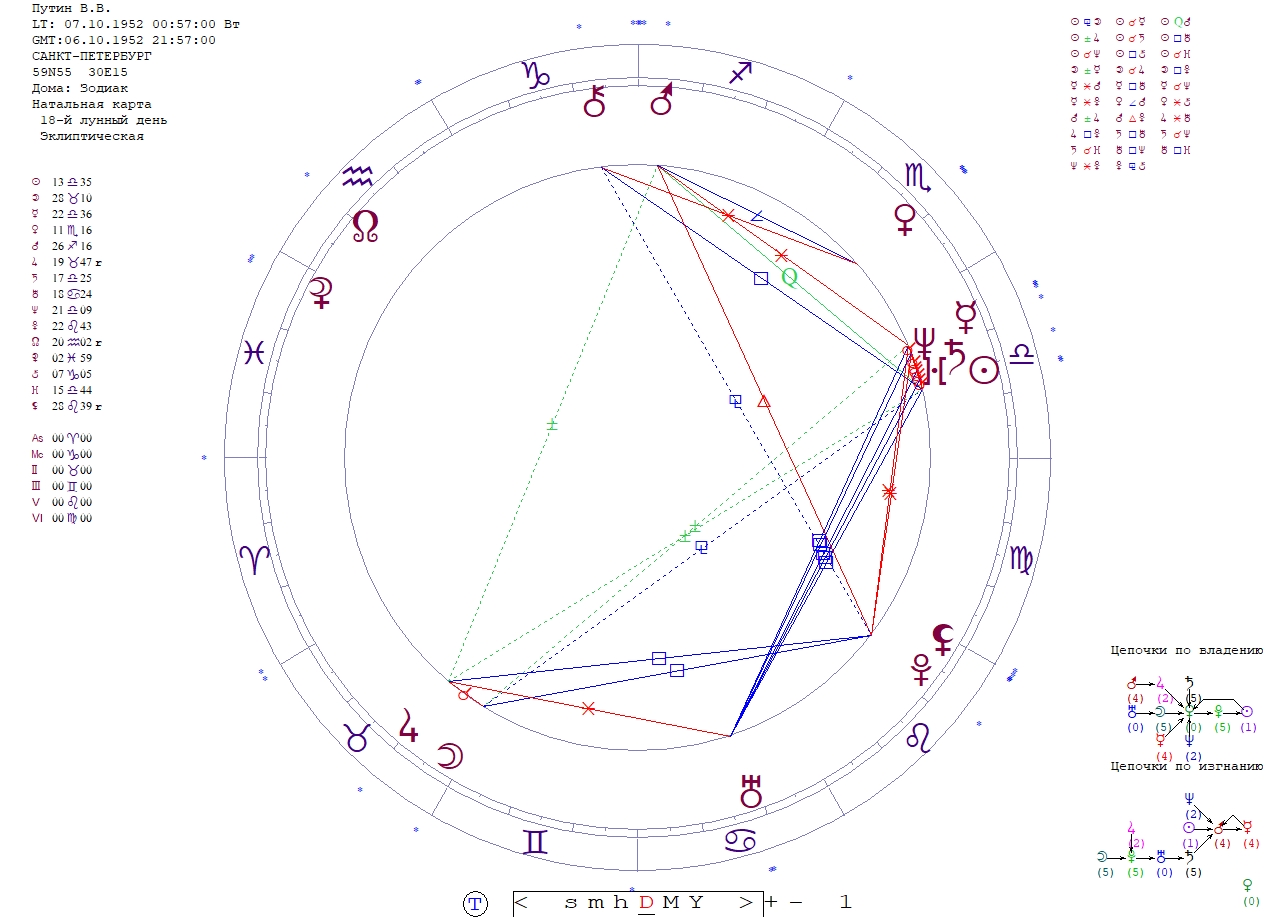Владимир Путин. А здесь уже превалируют негармоничные аспекты. Солнце в соединении с Прозерпиной - дает интеллект, но квадрате с Ураном и Хироном, в соединении с "сожженным" Меркурием. Что и говорить, человек читает по заранее написанному тексту. Управление идет за счет диктатуры - Марс в Стрельце, а Плутон во Льве.