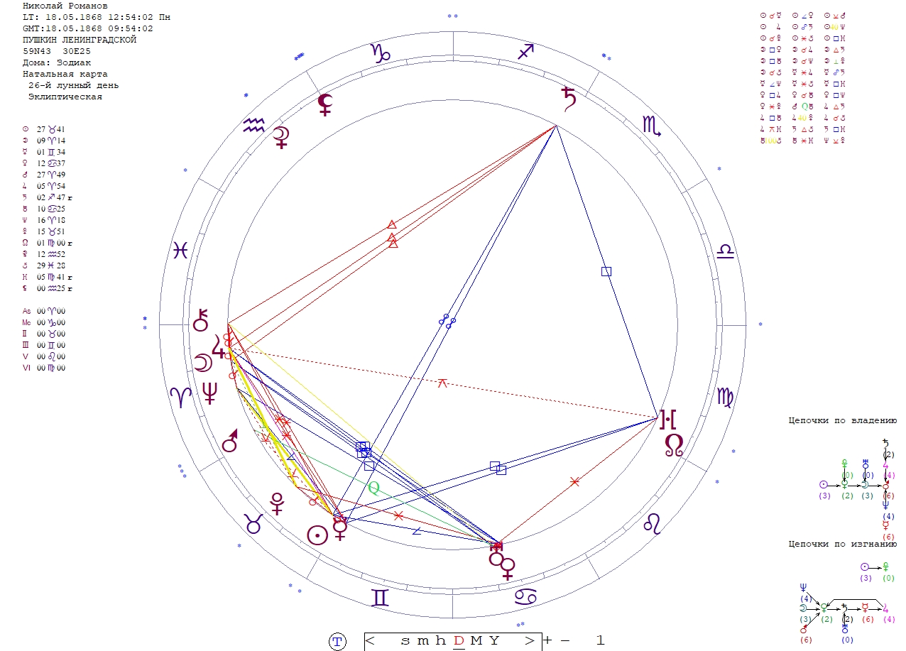 Николай II Романов: Меркурий в Близнецах, в конъюнкции с Солнцем и секстиле с Хироном. Прозерпина в деве, в квадрате с Солнцем и секстиле с Ураном. Ученые общаются как правило в узкой среде, и говорят иногда так: "трудно понять логику непрофессионала". А государственные деятели общаются с разными слоями населения, и им нужно понимать их логику.