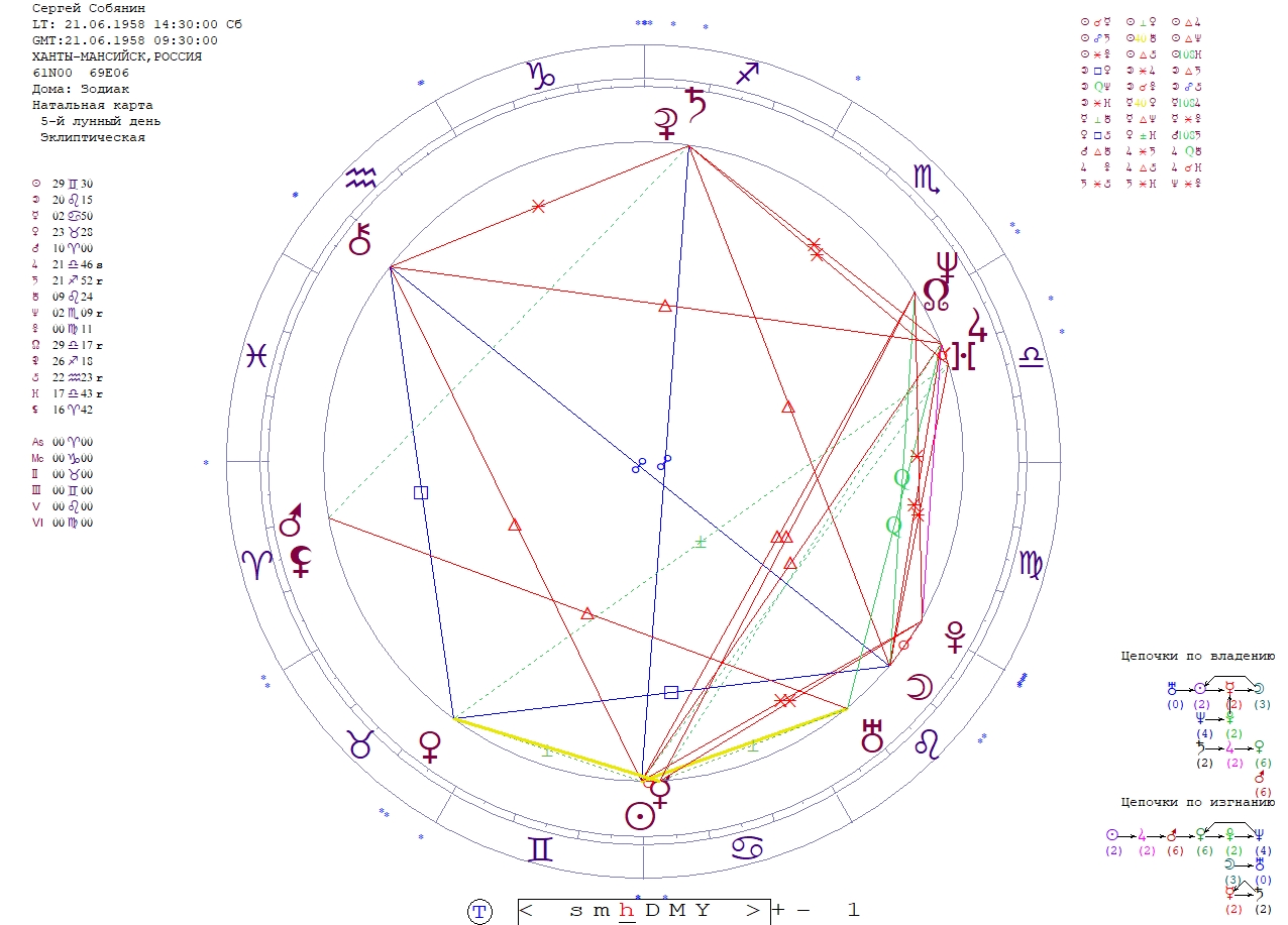 Сергей Собянин. Солнце в конъюнкции с Меркурием и трине с Хироном. Солнце в тридециле с Прозерпиной. Вроде все очень хорошо, но вследствие низкого сознания заставлял жителей Москвы совершить самое страшное преступление - делать генетическую прививку от ковида. Тем самым люди лишились кода ДНК данного Богом. Теперь они намного тысячелетий и ступеней эволюции отброшены назад. Даже не знаю, позволено ли им будет вообще воплощаться на Земле, ведь с 2010 г.всем отставшим в развитии запрещено воплощаться.