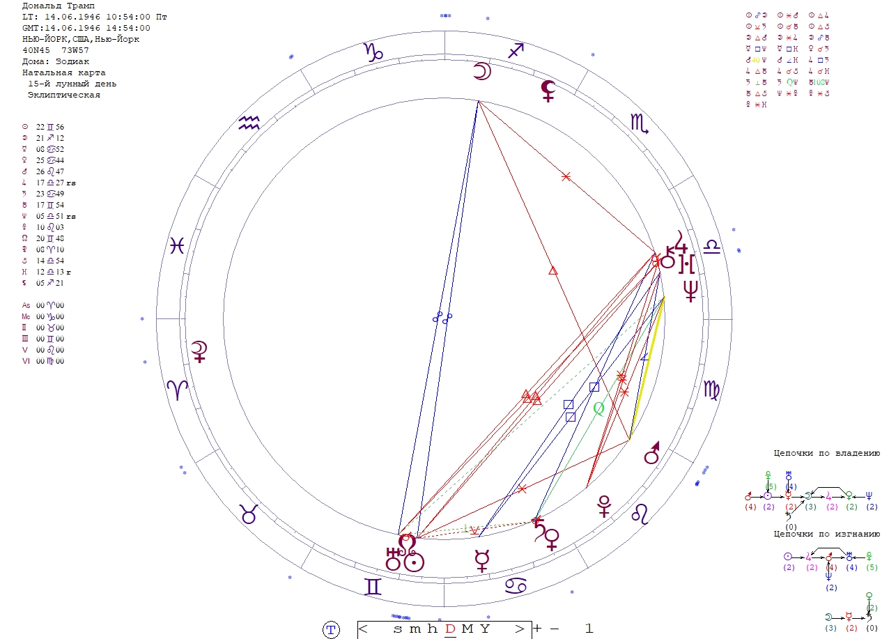Дональд Трамп. Здесь ситуация получше. Солнце в конъюнкции с Ураном, и обе планеты и в трине с Хироном. Меркурий в квадратуре с Прозерпиной.