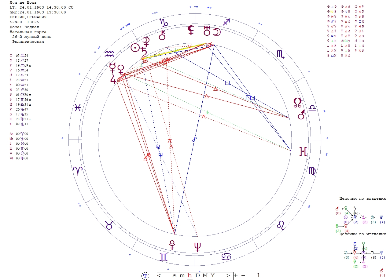 Луи де Воль. Меркурий и Солнце в Водолее. Солнце в нонагоне с Ураном, Уран в секстиле с Меркурием и квадрате с Прозерпиной.