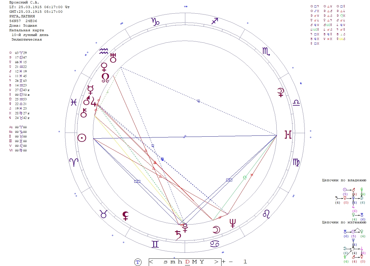 Сергей Вронский. Уран в Водолее, в дециле с Хироном. Солнце в оппозиции с Прозерпиной.