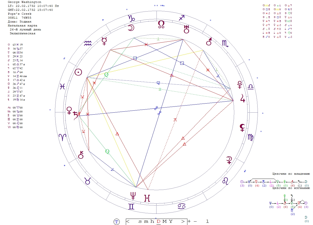Джорж Вашингтон: Меркурий в Водолее в секстиле с Ураном, Солнце в тригоне с Прозерпиной и секстиле с Хироном. Солнце в квадрате с Ураном. Он ученик Сен-Жермена, а у них свободы не бывает.
