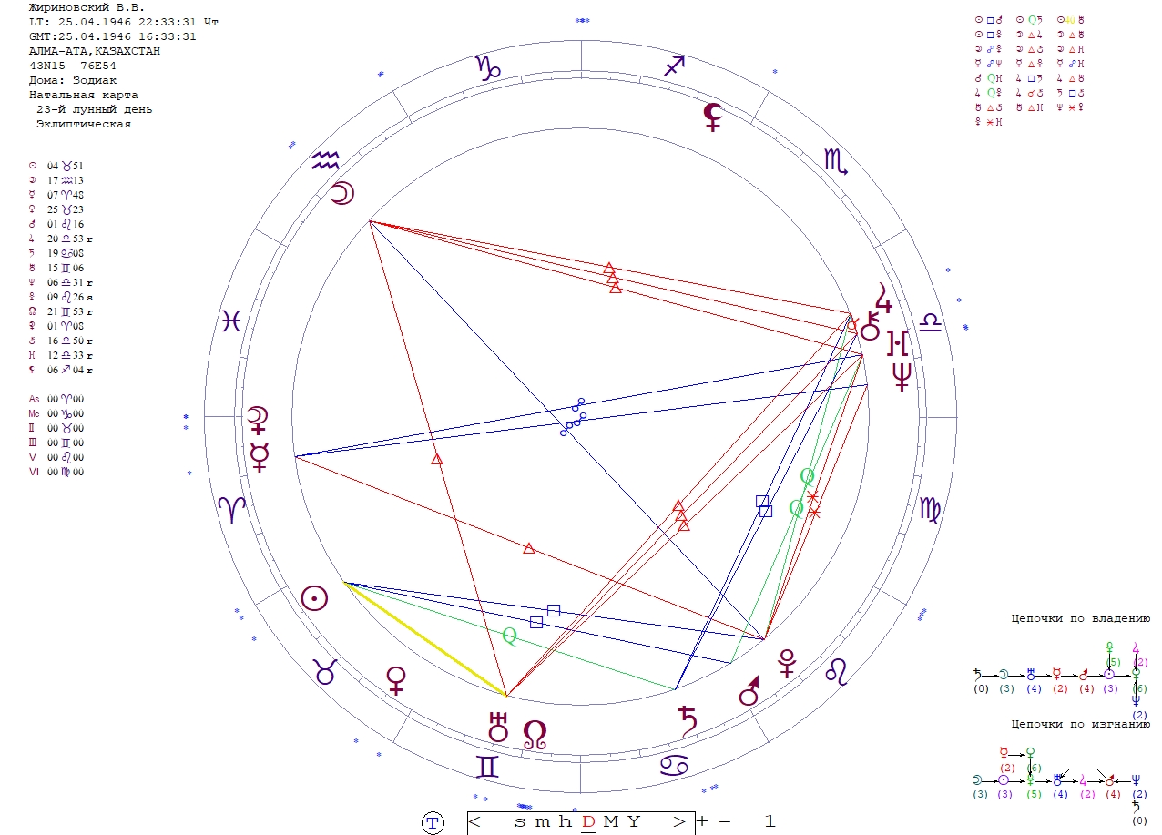 Владимир Жириновский: Солнце в нонагоне с Ураном, это не очень благоприятно, Меркурий в оппозиции с Прозерпиной. Уран в тригоне с Хироном и Прозерпиной. Не глупый индивид, практически с нуля основал одну из лидирующих партий. Но уровень сознания довольно низкий. Хотел узаконить проституцию, как он думал, под присмотром будет меньше венерических болезней, совершенно не понимая, что эти жрицы разносят куда более страшную заразу между всеми своими половыми клиентами, а именно - карму.