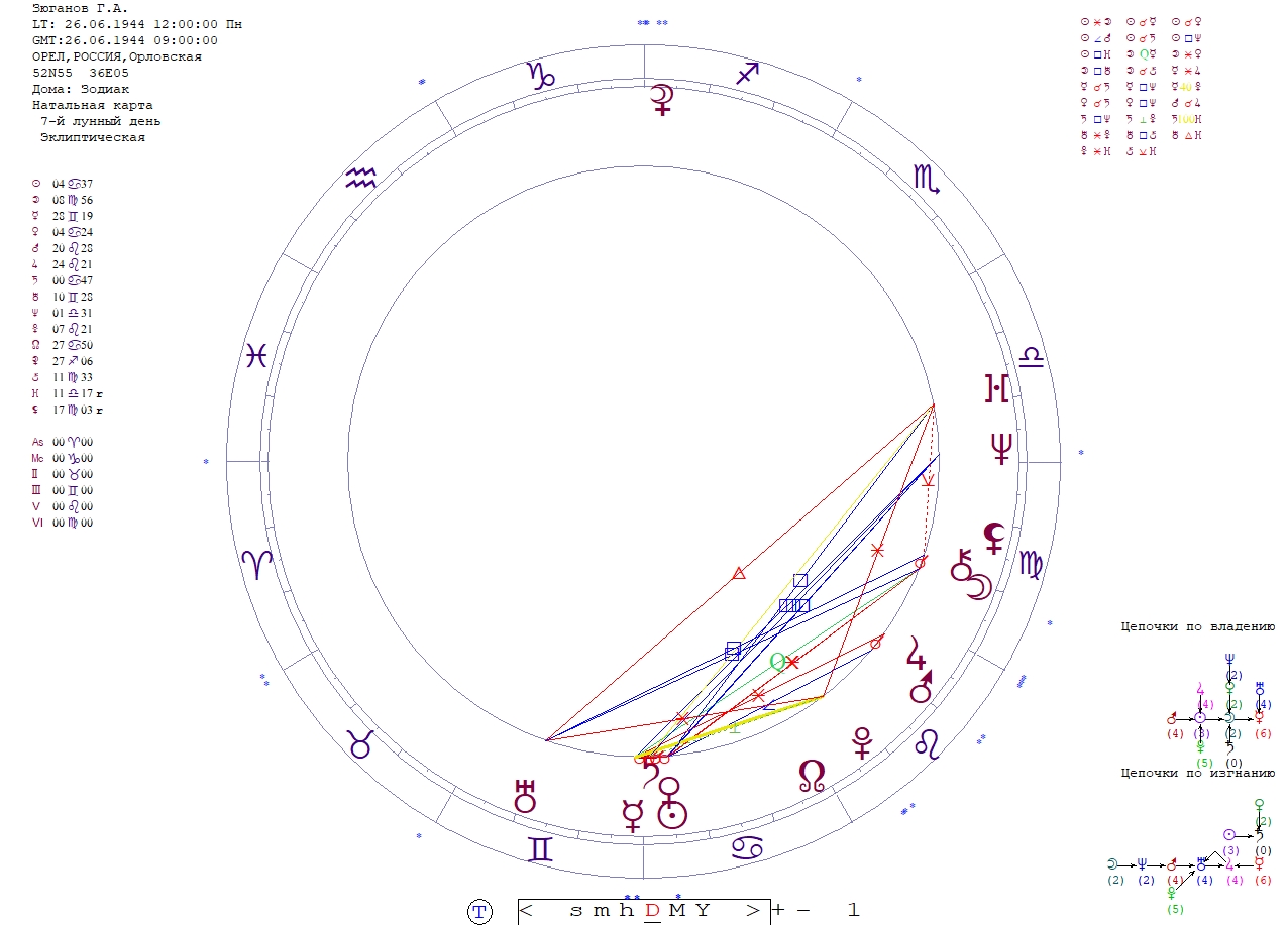 Геннадий Зюганов: Меркурий в Близнецах - "язык подвешен". Уран тоже в Близнецах в тригоне с Прозерпиной - интеллект есть, но Уран в квадратуре с Хироном - мыслительный процесс явно страдает. Еще бы, взял на себя карму безбожия и беззакония, как продолжатель дела Ленина.